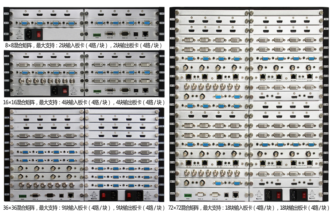 72×72插卡式混合矩陣,最大支持:18塊輸入板卡(每張板卡4路接口),18塊輸出板卡(每張板卡4路接口)
